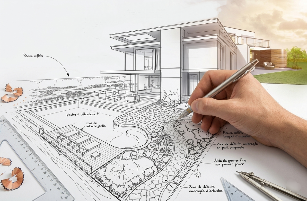 Analyse du site, élaboration d'un concept, plan d'aménagement, esquisses et croquis.